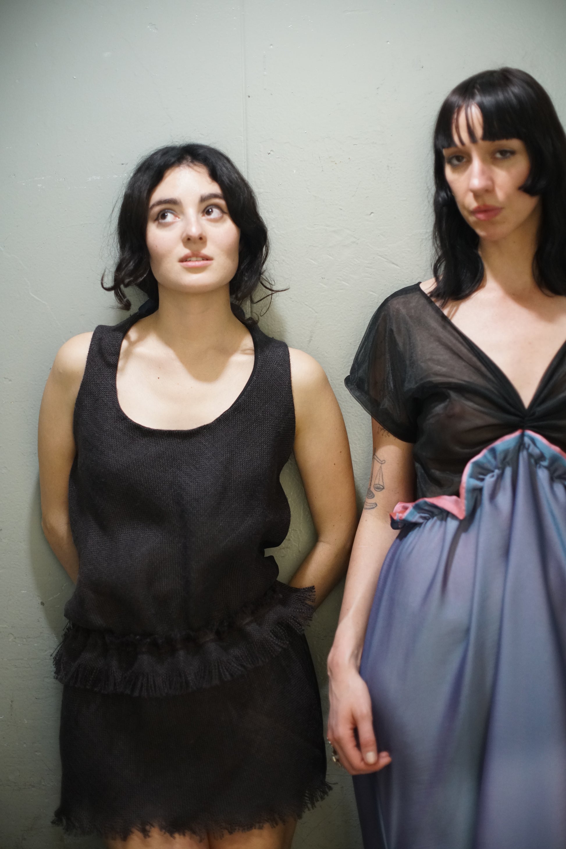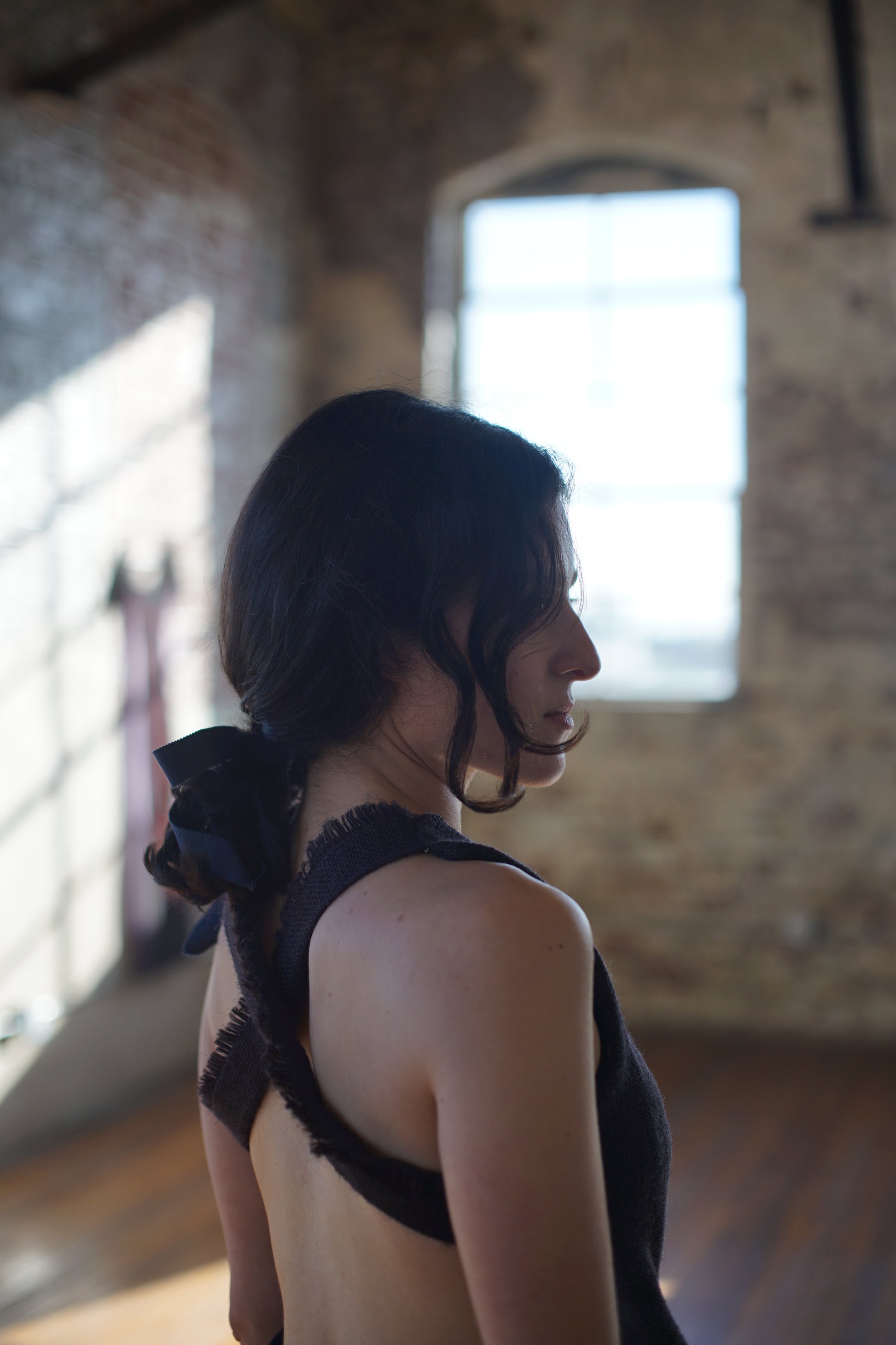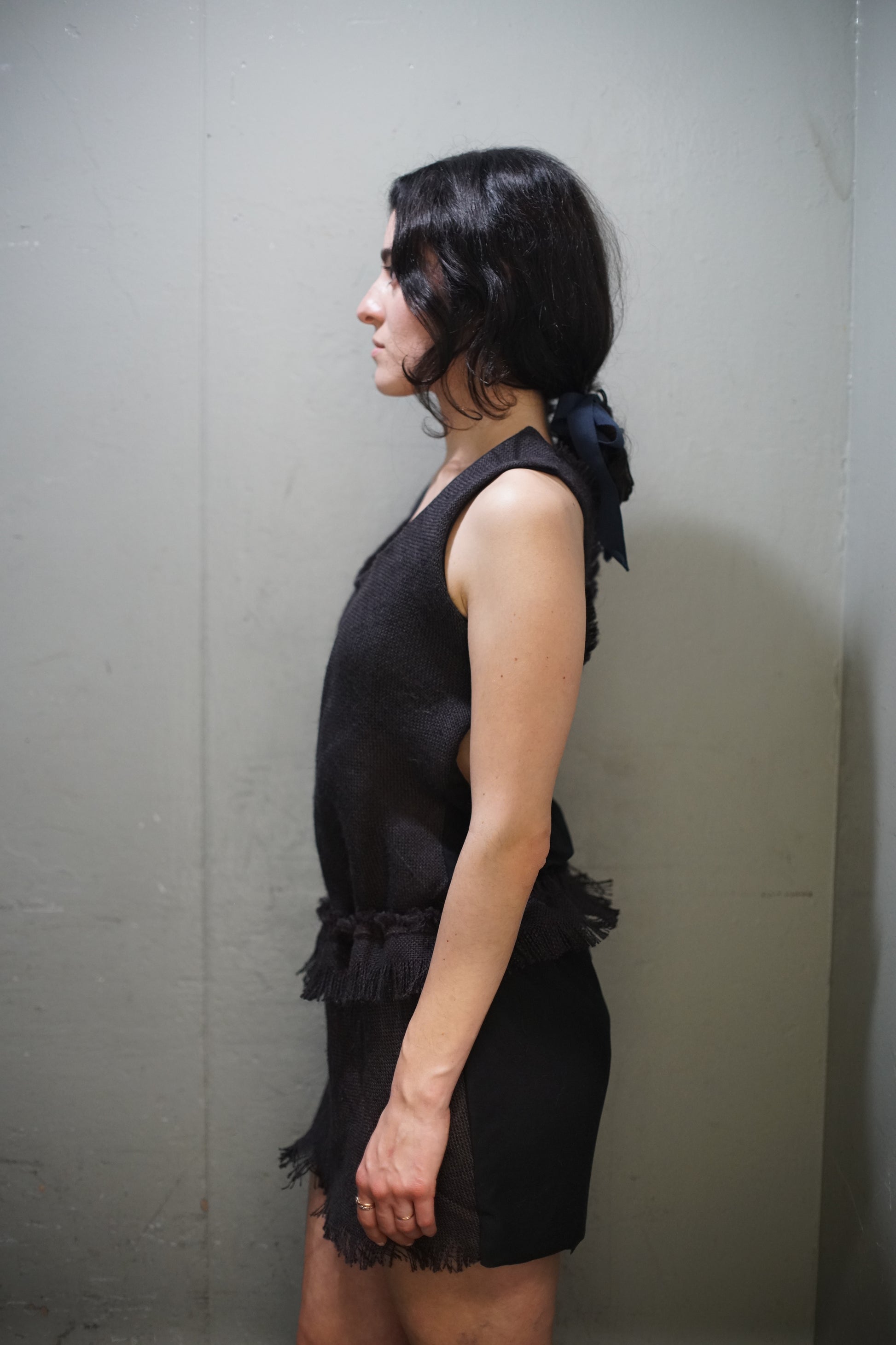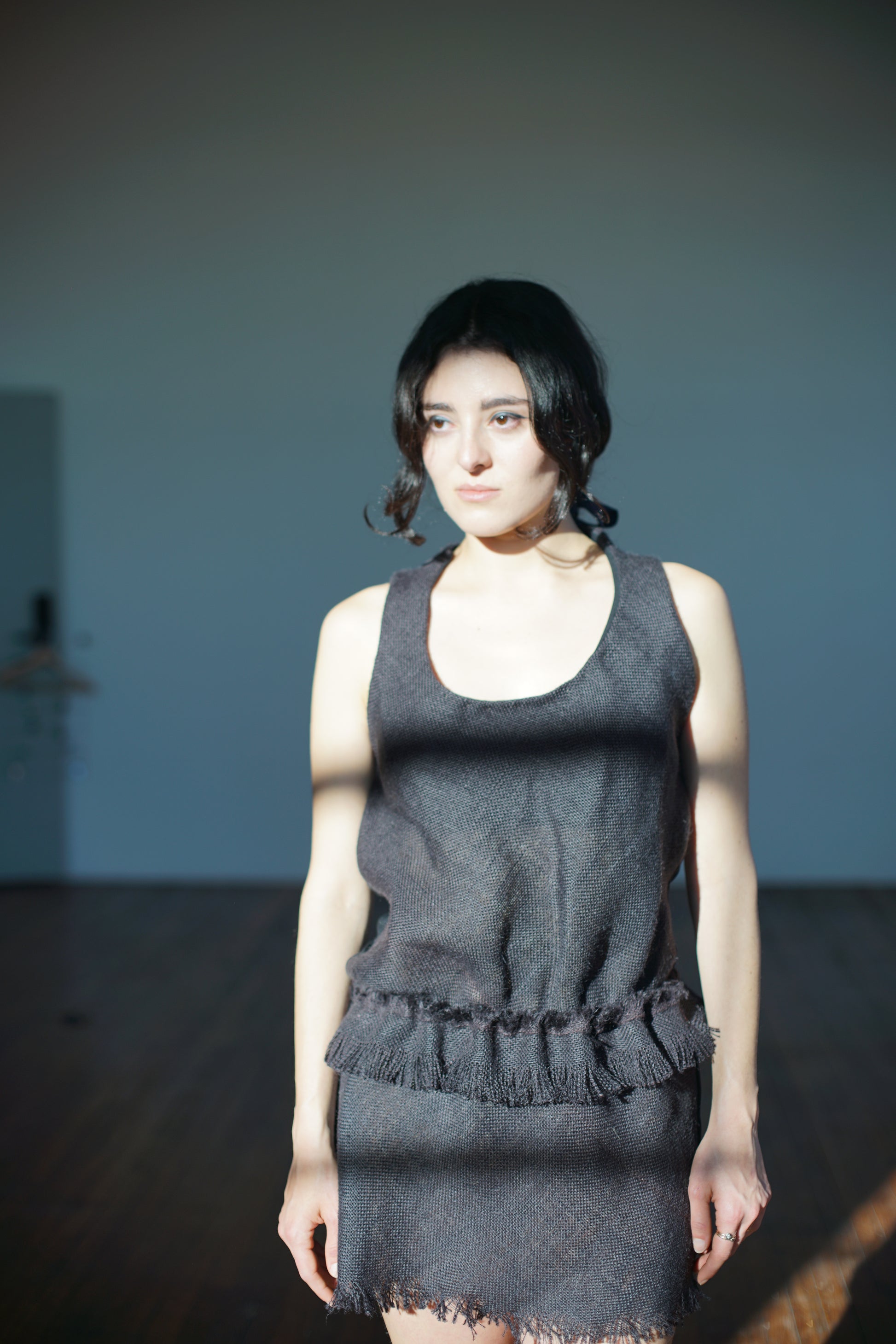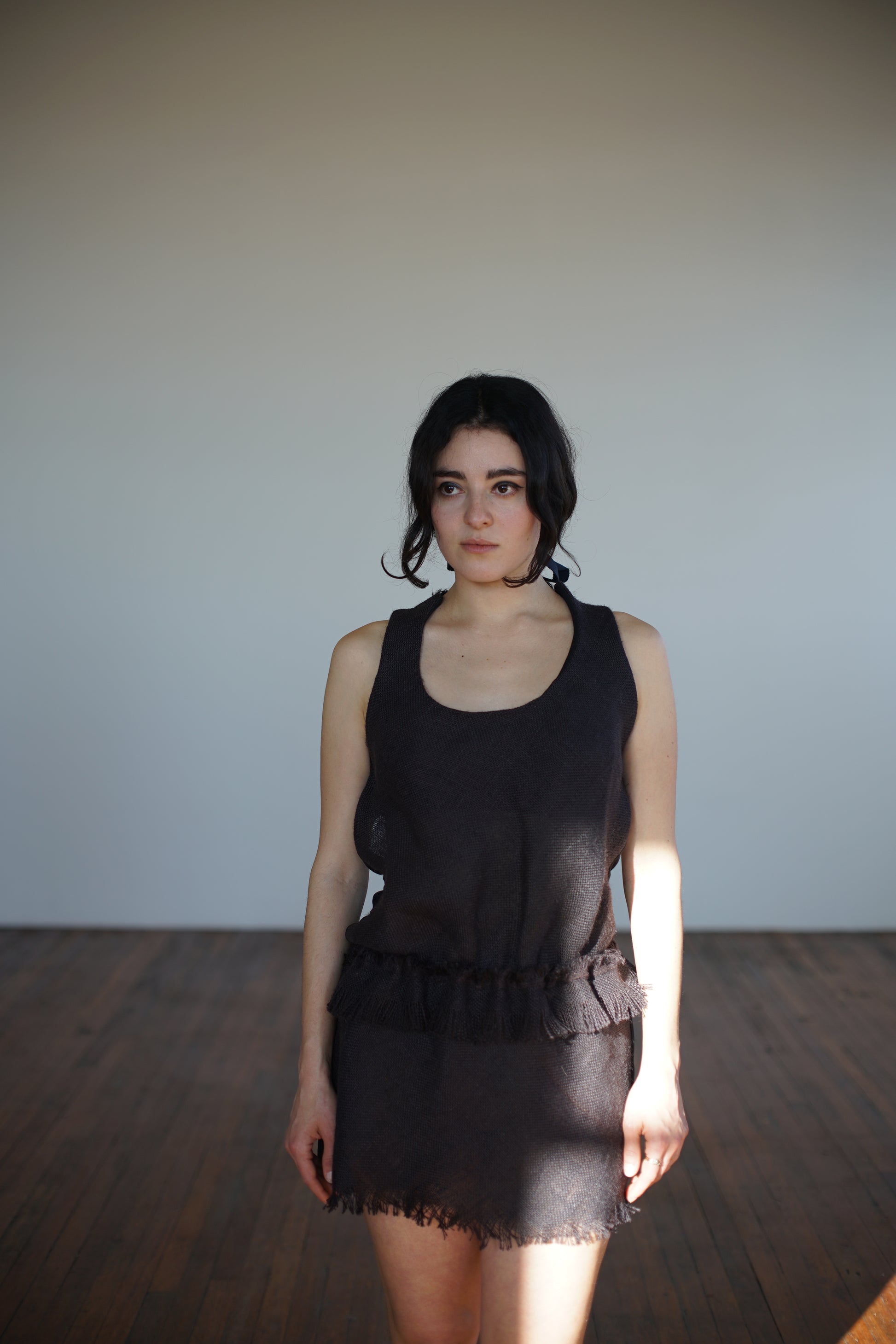 Play dress in black burlap (silk lined) and cotton back. Low rise fringe adjustable 'belt'. Criss cross back with fringe edge, raw bottom hem.